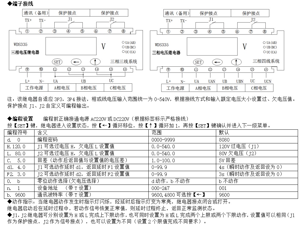 WDS335三相電壓監(jiān)視繼電器,適用于高壓35kv,10kv或低壓400v線路及用電設(shè)備,作為三相電壓檢測(cè)及控制設(shè)備。且具備過、欠電壓、缺相和延時(shí)動(dòng)作、返回功能,檢測(cè)精度高,是高低壓系統(tǒng)簡(jiǎn)便可靠的三相電壓繼電保護(hù)。