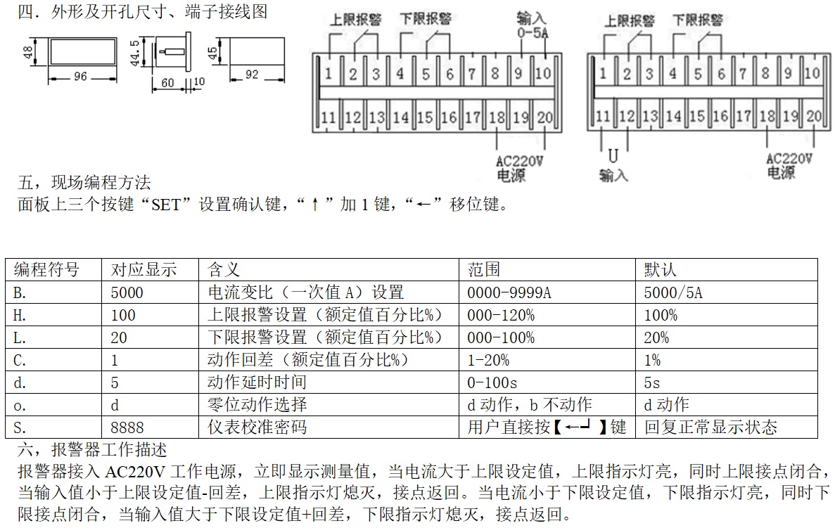 參數(shù):測量電流或電壓,報(bào)警輸出