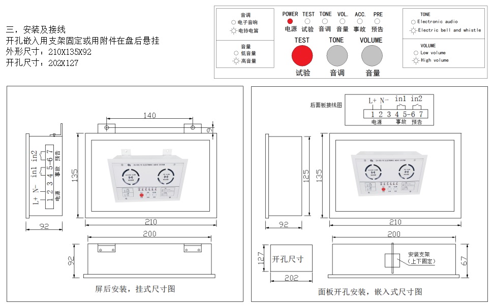 指示燈:6個LED指示,電源、試驗、音調(diào)、音量、事故、預告